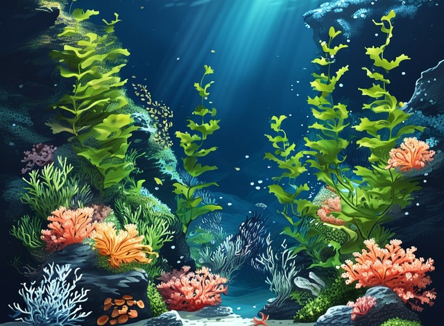 水下海藻和珊瑚。海洋植物、孤立的藻类、海石和花朵。自然元素,装饰水族馆经典矢量剪贴画
