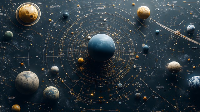 天体运行的示意图,各种行星环绕太阳,展示恒星和行星的关系。