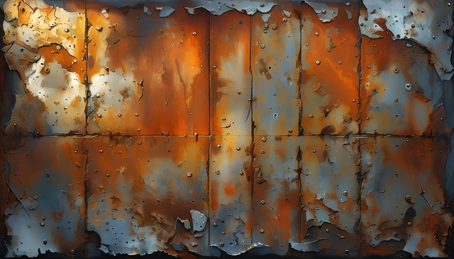 锈迹斑斑的金属背景上精美的黑色铁艺花纹与自然元素相结合。