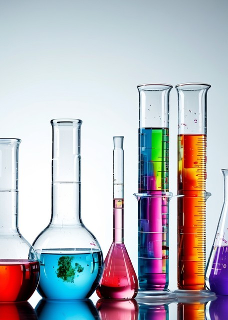 不同的实验室玻璃器皿,白色背景上有彩色液体