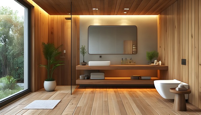 现代简约风格的木质浴室设计,具有干净的线条和自然元素。