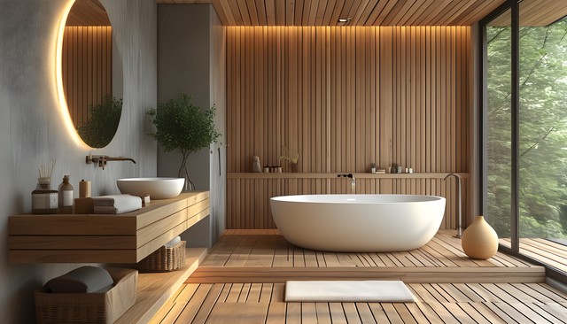 现代简约风格的木质浴室设计,具有干净的线条和自然元素。
