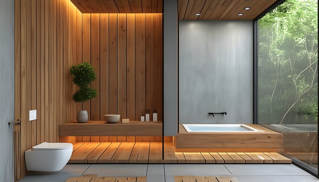 现代简约风格的木质浴室设计,具有干净的线条和自然元素。