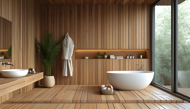 现代简约风格的木质浴室设计,具有干净的线条和自然元素。