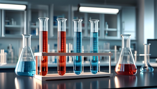实验室内的试管架,上面放着不同颜色的液体,氛围宁静,富有科学气息。
