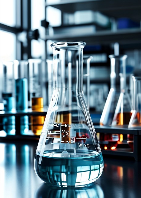 科学化学实验室用于药物研究的科学烧瓶玻璃或玻璃器皿设备、医学化学实验试管中的液体、医学药房溶液