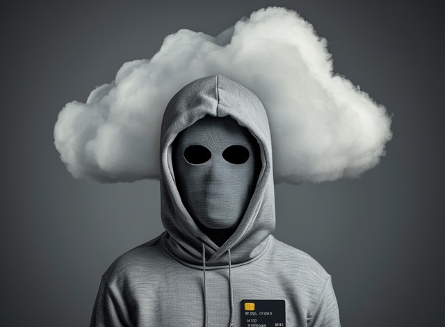 灰色套头衫黑客,没有信用卡和电脑的脸,云