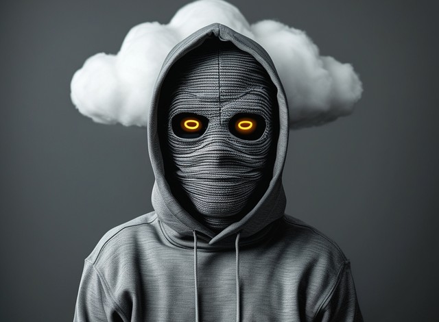 灰色套头衫黑客,没有信用卡和电脑的脸,云