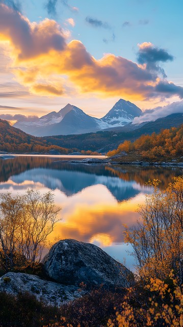 挪威美丽的自然:日落时的山脉、湖泊和充满活力的颜色