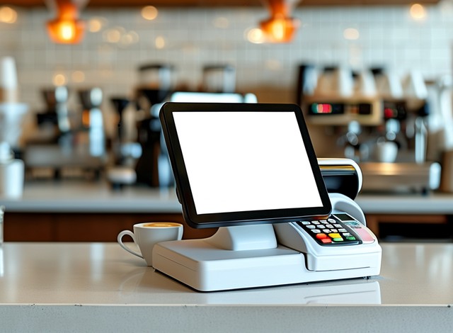 现代设计数字收银机的白色空白屏幕,带浓缩咖啡机的白色咖啡馆柜台收银台的条码扫描器,非接触式支付技术背