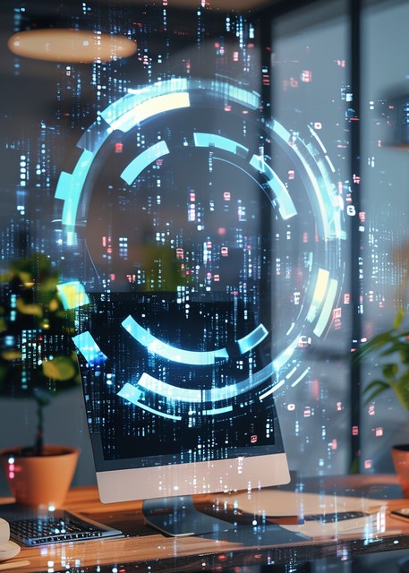 模糊办公室内部背景上抽象发光数字图标全息图。数字转型和技术概念。双重曝光。