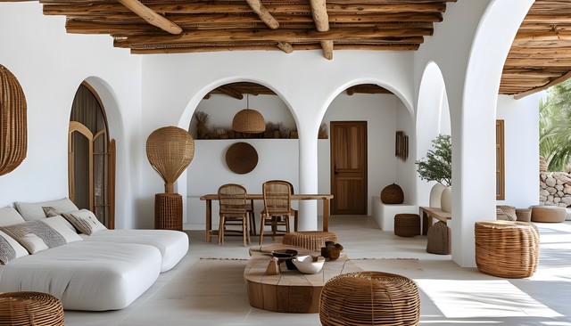 现代简约风格的室内空间,使用编织家具与自然元素,展现温馨与惬意