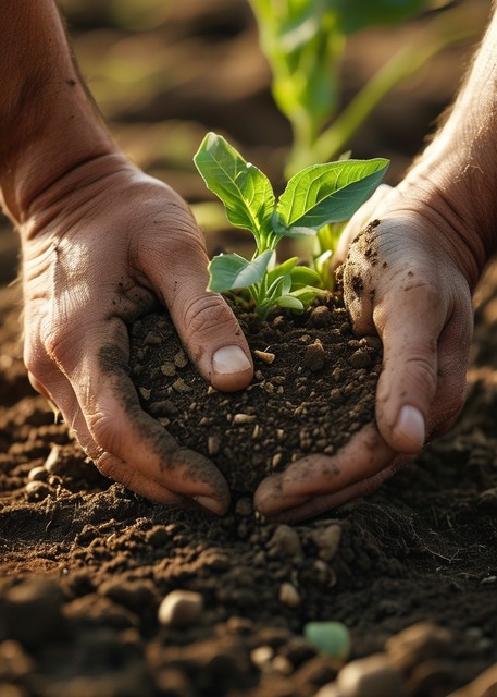 特写镜头捕捉到了手和土壤之间的亲密联系,触觉提醒我们与地球、环境、农业技术的联系。