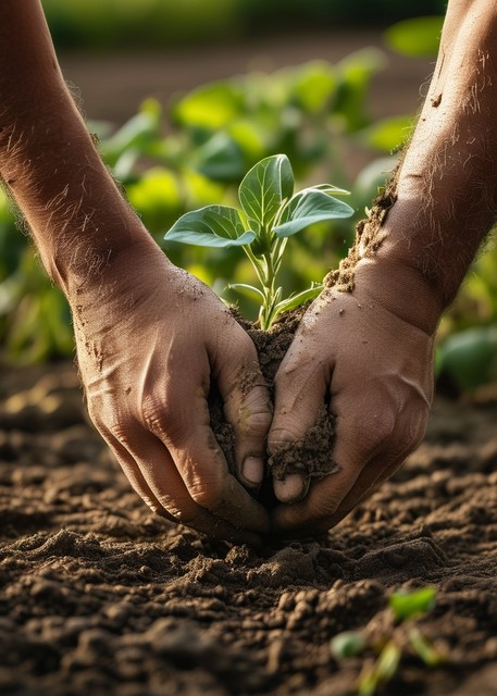 特写镜头捕捉到了手和土壤之间的亲密联系,触觉提醒我们与地球、环境、农业技术的联系。