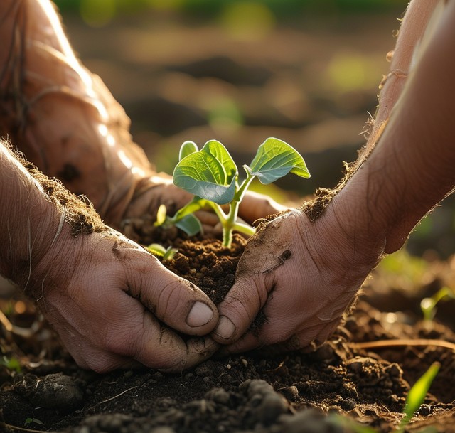 特写镜头捕捉到了手和土壤之间的亲密联系,触觉提醒我们与地球、环境、农业技术的联系。