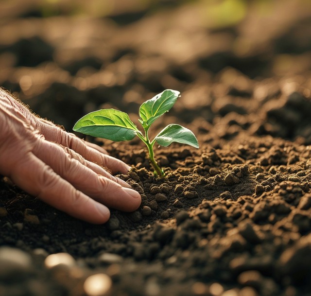 特写镜头捕捉到了手和土壤之间的亲密联系,触觉提醒我们与地球、环境、农业技术的联系。