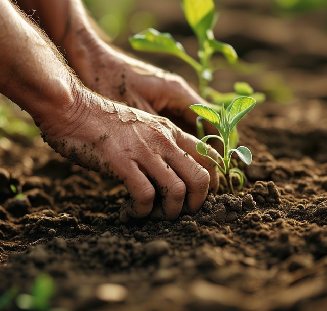 特写镜头捕捉到了手和土壤之间的亲密联系,触觉提醒我们与地球、环境、农业技术的联系。
