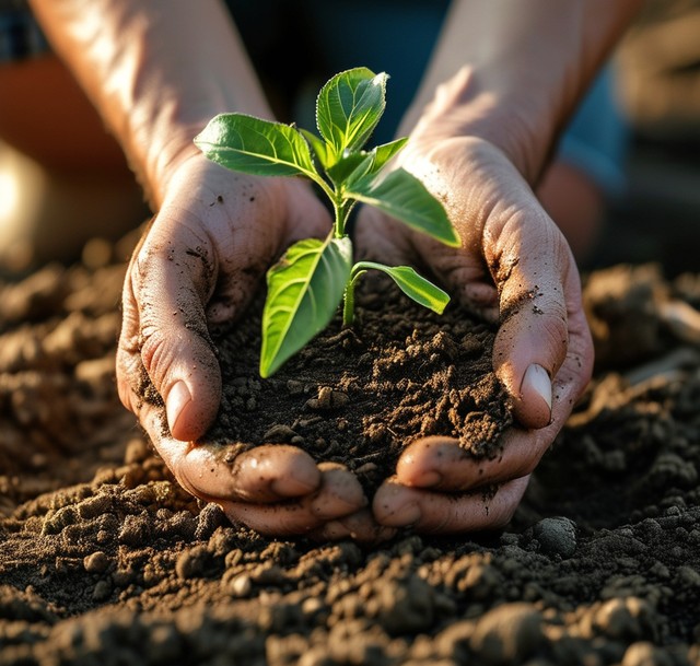 特写镜头捕捉到了手和土壤之间的亲密联系,触觉提醒我们与地球、环境、农业技术的联系。