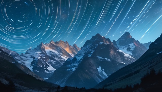 星空下的星轨,雄伟的山脉在夜空中若隐若现,展现自然的神秘之美。