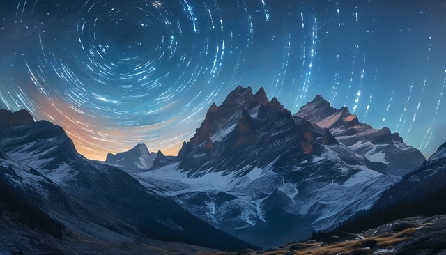 星空下的星轨,雄伟的山脉在夜空中若隐若现,展现自然的神秘之美。