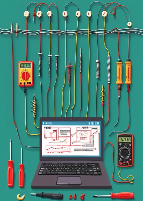 设置线路电压表、笔记本电脑、电工和螺丝刀。商业信息图模板。矢量