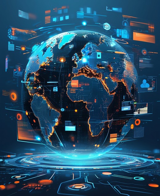 具有各种技术元素的高科技矢量插图。抽象的全球科幻概念。蓝色背景下的数字互联网通信。广泛的网络安全互联