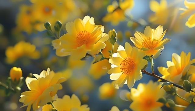 阳光透过盛开的黄色花朵,展现自然的美丽与生机。