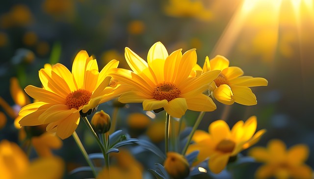 阳光透过盛开的黄色花朵,展现自然的美丽与生机。
