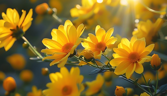 阳光透过盛开的黄色花朵,展现自然的美丽与生机。