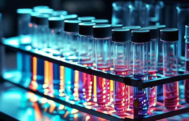 实验室中,试管排列整齐,荧光液体闪烁着科学的光芒。