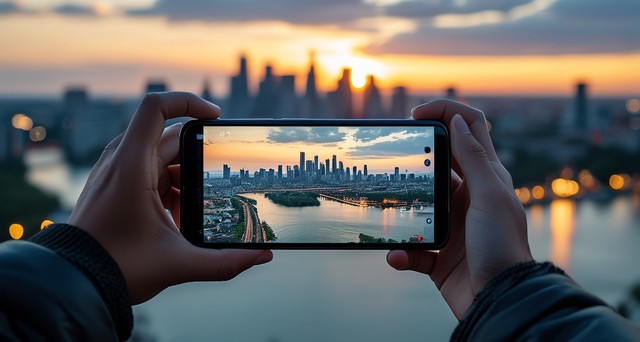 智能手机拍摄城市天际线,社交媒体影响力者现场直播。