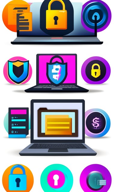 设置非同质化代币数字加密艺术、网络安全、加密货币钱包、带商店应用程序的笔记本电脑、文档、锁和图标。矢