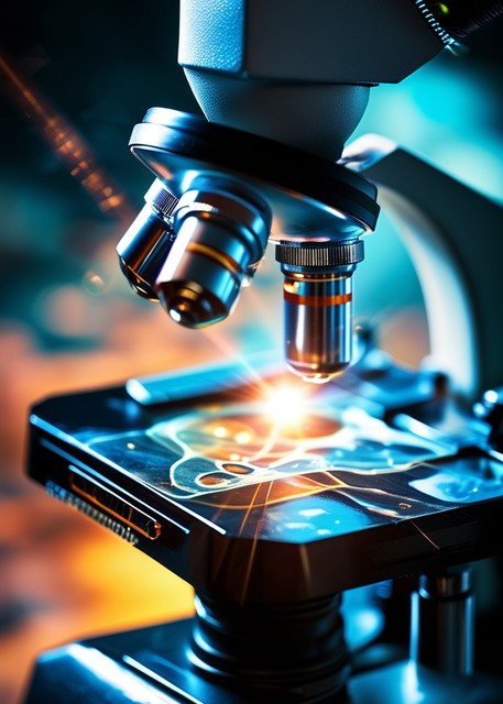 显微镜聚焦在科学研究中,镜头下显示出细胞结构和光线效果
