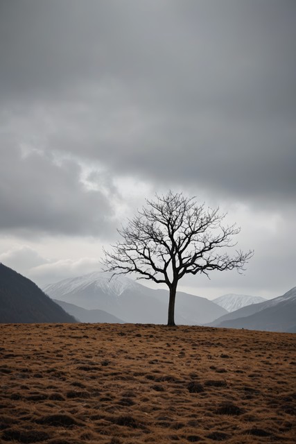 田野里有一棵孤树背景是山脉高清风景摄影图片
