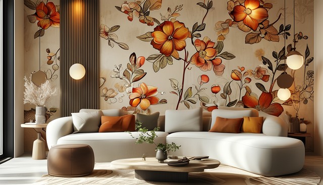 现代家居风格的客厅,墙上有花卉图案,搭配自然元素和温暖灯光。