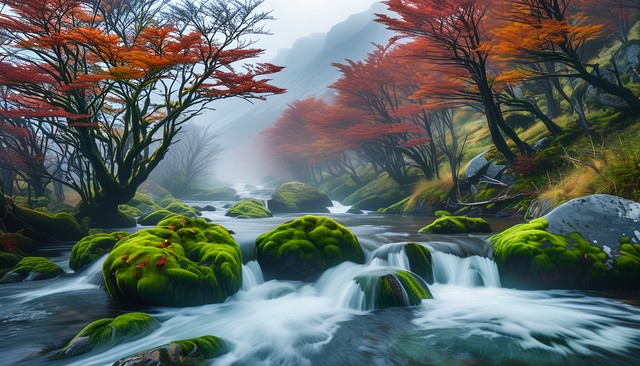 巴塔哥尼亚漂流溪流,青苔覆盖的岩石和秋季色彩的树木,雾气弥漫,自然美景。
