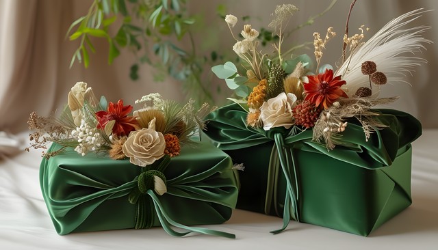 精美的手工包裹,搭配干花和自然元素,创意的绿色丝绒布料与装饰,展现出独特的生活美学。