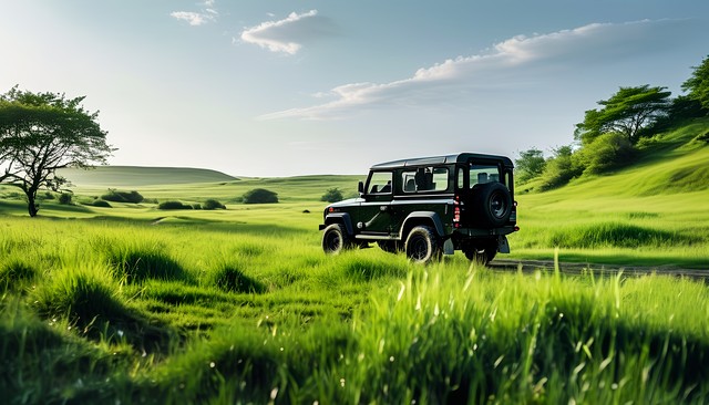 一辆黑色越野车在青翠的草地上行驶,周围环境宁静而自然,展现出大自然的美丽与和谐。