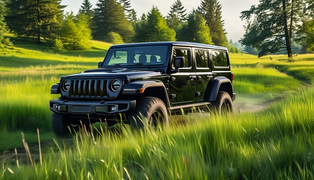 一辆黑色越野车在青翠的草地上行驶,周围环境宁静而自然,展现出大自然的美丽与和谐。