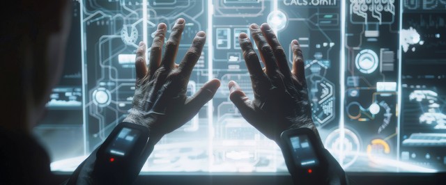 手握着代表数字技术的元素,在充满数字化符号和界面的抽象背景