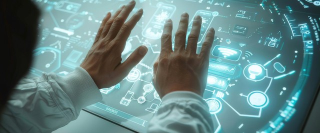 手握着代表数字技术的元素,在充满数字化符号和界面的抽象背景