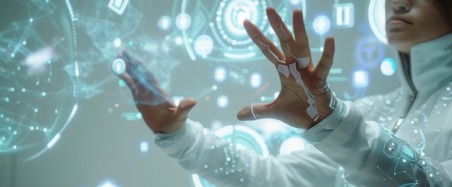 手握着代表数字技术的元素,在充满数字化符号和界面的抽象背景