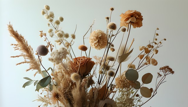 一束干花,包含多种植物元素,色调柔和,背景简约,展现自然的优雅与安宁。