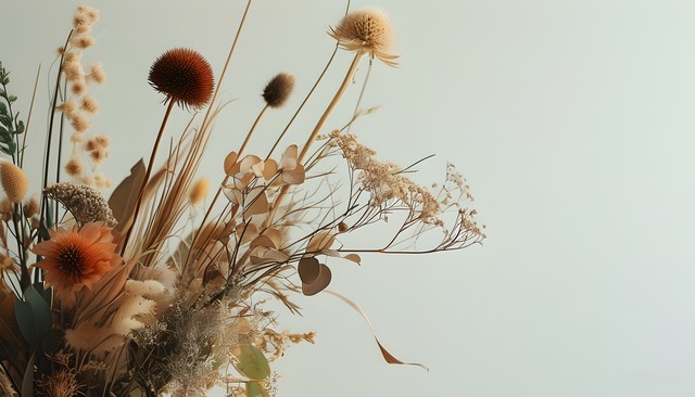 一束干花,包含多种植物元素,色调柔和,背景简约,展现自然的优雅与安宁。