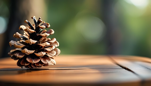 一颗放置在木桌上的干松果,背景虚化,突出自然元素与宁静氛围。