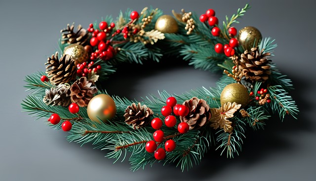 一圈自然元素装饰的圣诞花环,包含松枝、红色浆果、松果和金色装饰,展现出节日的气氛和温馨感。