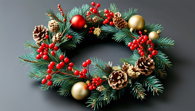 一圈自然元素装饰的圣诞花环,包含松枝、红色浆果、松果和金色装饰,展现出节日的气氛和温馨感。