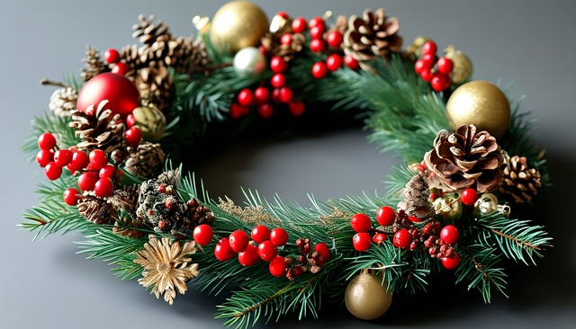 一圈自然元素装饰的圣诞花环,包含松枝、红色浆果、松果和金色装饰,展现出节日的气氛和温馨感。