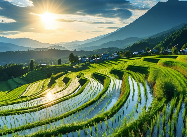 美丽的田园风光,阳光洒在波浪起伏的稻田上,山脉与村庄交错,和谐自然。