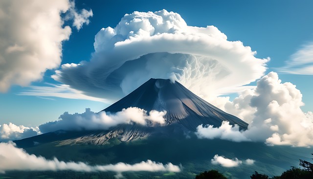 一座雄伟的火山,顶部被云层环绕,展现出大自然的壮丽景象,触发人们对自然力量的思考。